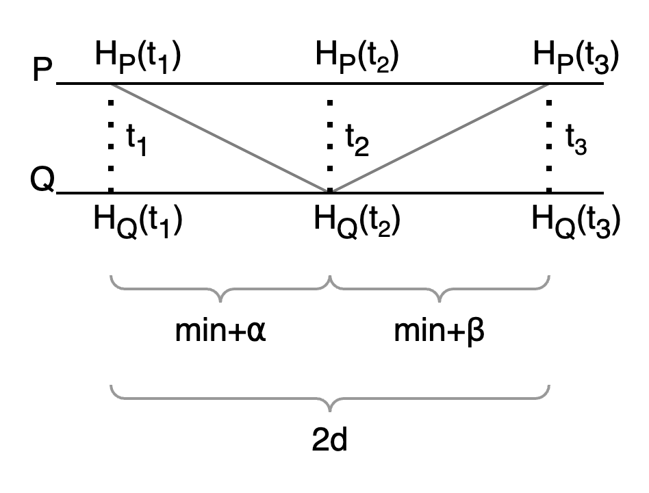 Thus, in order to minimize the maximum error, \(P\) choose the midpoint of this interval as the estimate of \(Q\)'s clock value at \(t_3\):